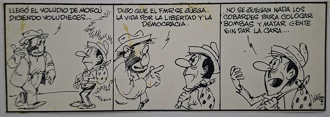 Obra visual en formato rectangular y disposición horizontal. Dibujo monocromo. Está compuesto de tres cuadros y protagonizados por dos figuras masculinas.