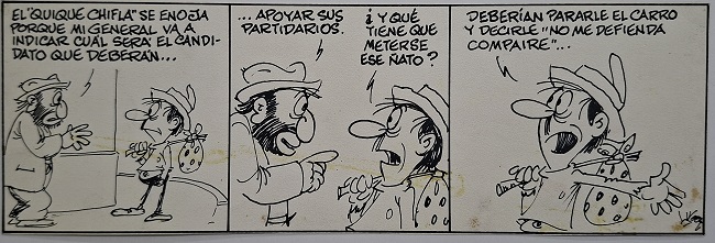 Obra visual en formato rectangular y disposición horizontal. Dibujo monocromo. Está compuesto de tres cuadros y protagonizados por dos figuras masculinas.
