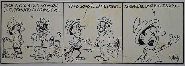 Obra visual en formato rectangular y disposición horizontal. Dibujo monocromo. Está compuesto de tres cuadros y protagonizados por dos figuras masculinas.
