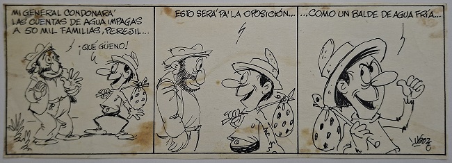 Obra visual en formato rectangular y disposición horizontal. Dibujo monocromo. Está compuesto de tres cuadros y protagonizados por dos figuras masculinas.
