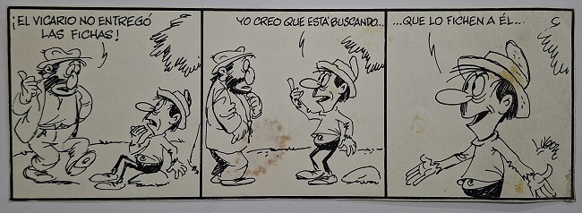 Obra visual en formato rectangular y disposición horizontal. Dibujo monocromo. Está compuesto de tres cuadros y protagonizados por dos figuras masculinas.