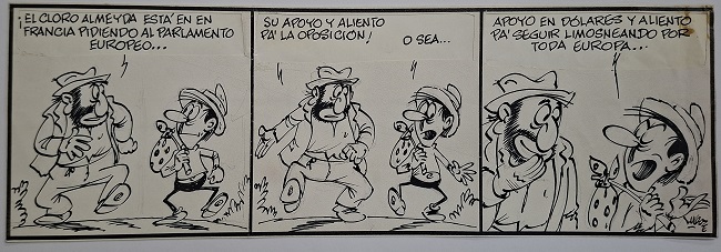 Obra visual en formato rectangular y disposición horizontal. Dibujo monocromo. Está compuesto de tres cuadros y protagonizados por dos figuras masculinas.