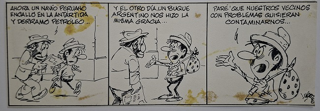 Obra visual en formato rectangular y disposición horizontal. Dibujo monocromo. Está compuesto de tres cuadros y protagonizados por dos figuras masculinas.
