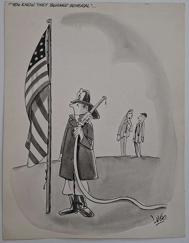 Obra visual en formato rectangular y disposición vertical. Dibujo monocromo. En el primer plano de la composición, una figura masculina de cuerpo completo de pie junto a un mástil con una bandera de Estados Unidos, de fondo dos figuras masculinas conversando.