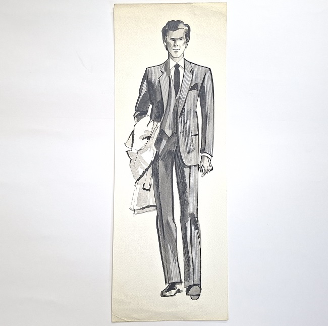 Obra visual en formato rectangular y orientación vertical. Dibujo monocromo. En el centro de la composición, una figura masculina de pie caminando de frente. Viste un traje formal, en una de sus manos lleva un abrigo.