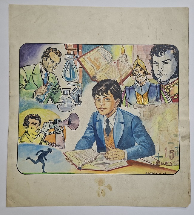 Obra visual en formato rectangular y disposición horizontal. Dibujo policromado. En el centro de la composición, una figura masculina con uniforme de estudiante revisando un libro sobre un escritorio. Arriba figuras masculinas realizando diversas actividades.