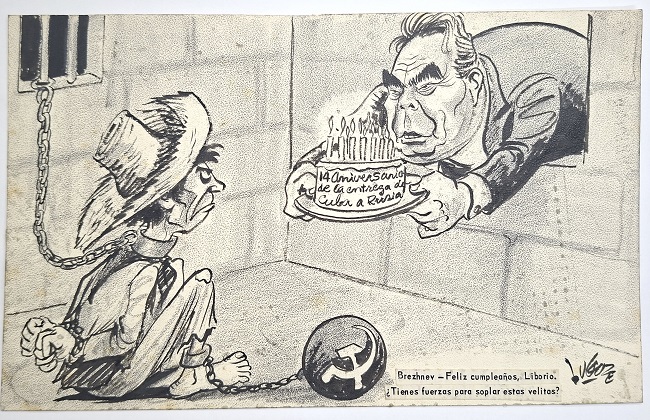 Obra visual en formato rectangular y disposición horizontal. Dibujo monocromo. En la composición se destacan dos figuras masculinas. Una de ellas está sentada con las manos atadas, el otro está apoyado en una ventana mientras sostiene un pastel.