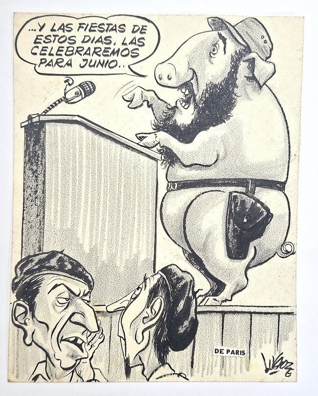 Obra visual en formato rectangular y disposición vertical. Dibujo monocromo. En el primer plano de la composición, dos figuras masculinas, de medio cuerpo, conversando. De fondo, y de perfil, una figura antropomórfica sobre una superficie.