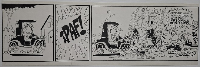 Obra visual de formato rectangular y disposición horizontal. Dibujo monocromo. Está compuesto por tres viñetas protagonizadas por dos figuras masculinas.