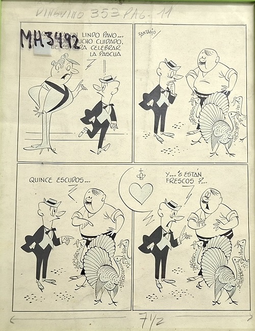 Este dibujo se publicó en la revista El Pingüino N°353, en la página 11. Esta publicación, destinada a un público adulto, estuvo vigente en Chile desde 1956 hasta 1969.
