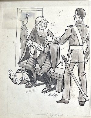 Obra visual de formato rectangular y disposición vertical. Dibujo monocromo. En el centro de la composición dos figuras masculinas de pie conversando. El de la izquierda viste una manta y sostiene un sombrero, el de la derecha viste un traje de policía.