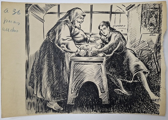 Obra visual de formato rectangular y disposición horizontal. En el primer plano de la composición dos figuras masculinas apoyadas sobre una superficie, de fondo una ventana y varios objetos.
