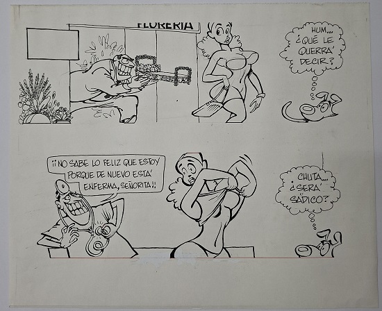 Obra visual de formato rectangular y disposición horizontal. Dibujo monocromo. Está compuesto por seis escenas protagonizadas por una figura femenina y masculina.