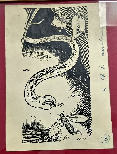 Obra visual de formato rectangular y disposición vertical. Dibujo monocromo. En el centro de la composición dos figuras invertebradas en medio de paisaje rodeado de elementos fitomorfos.