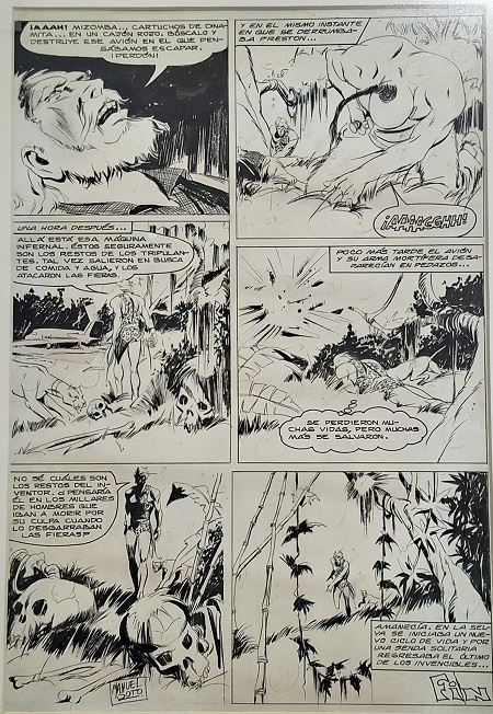 Obra visual de formato rectangular y disposición vertical. Dibujo monocromo. Está compuesto por seis viñetas protagonizadas por varias figuras masculinas, en medio de paisaje boscoso.