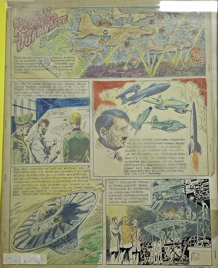 Obra visual de formato rectangular y disposición vertical. Dibujo monocromo. Está compuesto por cinco viñetas protagonizadas por varias figuras masculinas. Tiene un papel semi traslúcido adherido en la parte superior, que recibe el nombre de camisa de color.