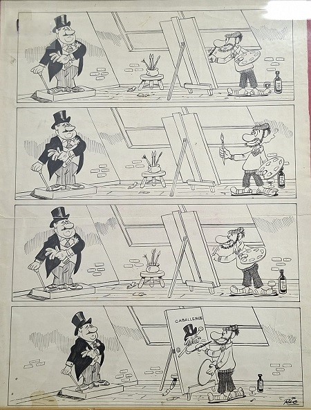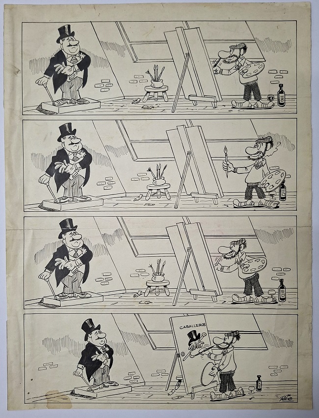 Obra visual de formato rectangular y disposición vertical. Dibujo monocromo. Está compuesto por cuatro escenas protagonizadas por dos figuras masculinas.
