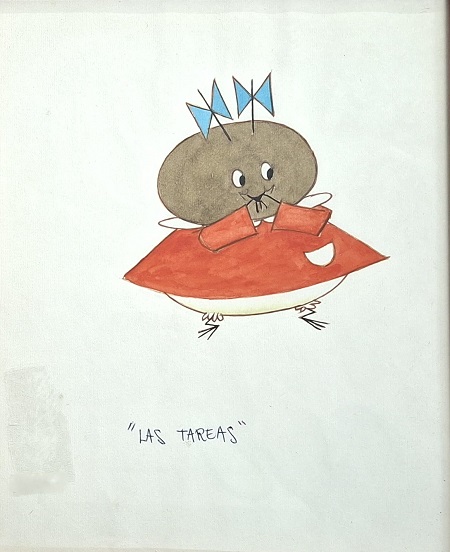 Obra visual de formato rectangular y disposición vertical. Dibujo policromado. En el centro de la composición se ubica una figura antropomorfa de cabeza oval oscura, viste un traje rojo. Debajo, un título manuscrito que dice: “Las tareas”.