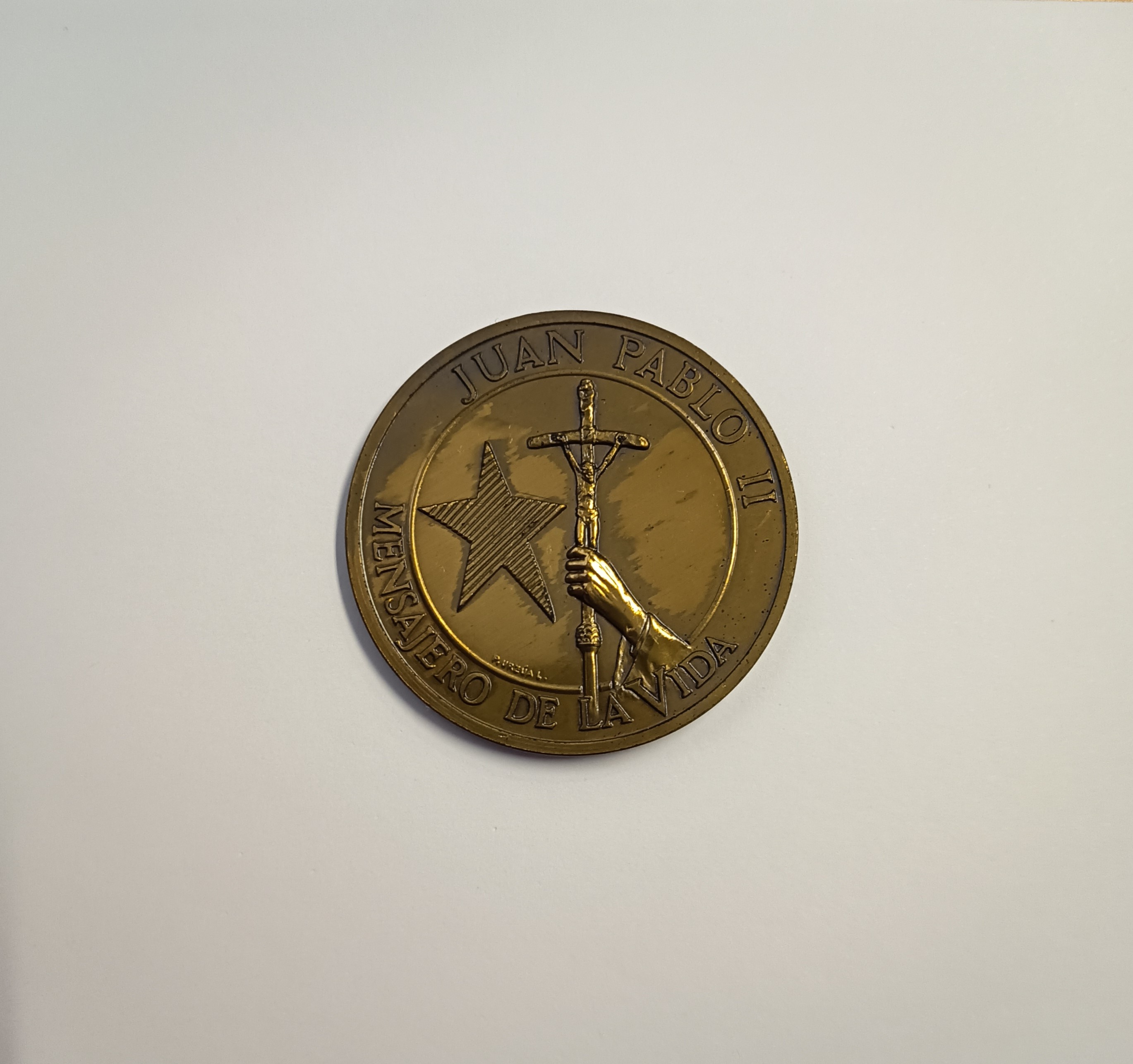 Al centro del reverso se representa una mano que emerge desde el ángulo inferior derecho, sosteniendo un báculo rematado por un crucifijo con la imagen de Cristo crucificado. A la izquierda se observa una estrella de cinco puntas con textura lineal interior. En la parte inferior izquierda del crucifijo se encuentra la firma del grabador: P.ÚRZUA L. Rodeando la imagen central, en disposición circular, se lee la inscripción: “JUAN PABLO II” en la parte superior y “MENSAJERO DE LA VIDA” en la parte inferior.