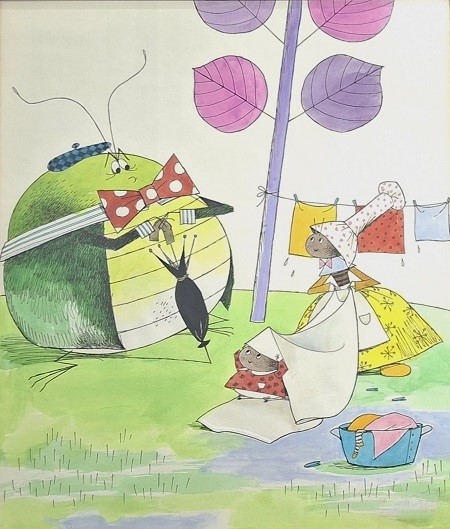 Obra visual de formato rectangular y disposición vertical. Dibujo policromado. En el primer plano de la composición tres figuras antropomorfas, de cuerpo completo, conversando. De fondo, un árbol con hojas de color púrpura.