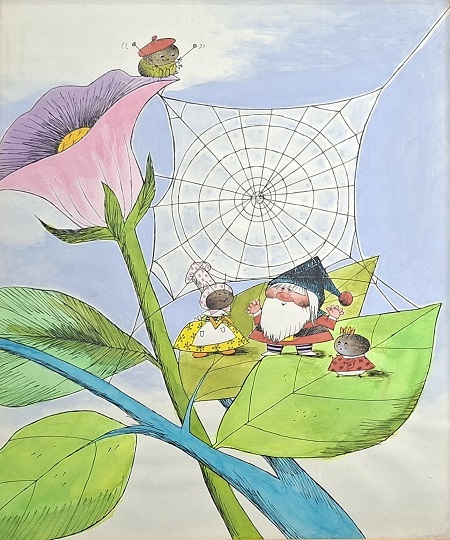 Obra visual de formato rectangular y disposición vertical. Dibujo policromado. En el primer plano de la composición tres figuras de cuerpo completo caminando sobre la hoja de una flor.