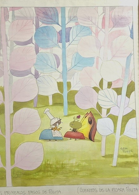 Obra visual de formato rectangular y disposición vertical. Dibujo policromado. En el centro de la composición dos figuras de cuerpo completo realizando actividades, en medio de paisaje boscoso.