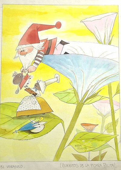 Obra visual de formato rectangular y disposición vertical. Dibujo policromado. En el primer plano de la composición tres figuras de cuerpo completo realizando actividades sobre la hoja de una flor.