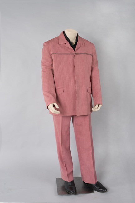 Ambo compuesto por chaqueta y pantalón color rosa viejo. La chaqueta tiene corte recto, de tipo casual. Tiene un cuello tipo camisa y tiene una línea horizontal decorativa en el pecho, un vivo contrastante confeccionado en gamuza de un rosado más oscuro. Tiene 5 botones del mismo color. Los pantalones son rectos. Perteneció a Zalo Reyes.