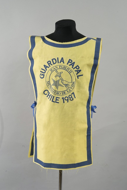 Pechera usada por los jóvenes voluntarios que ayudaron a recibir el papa Juan Pablo II.