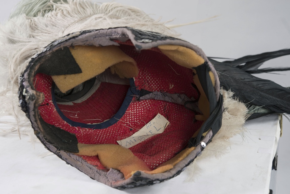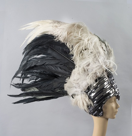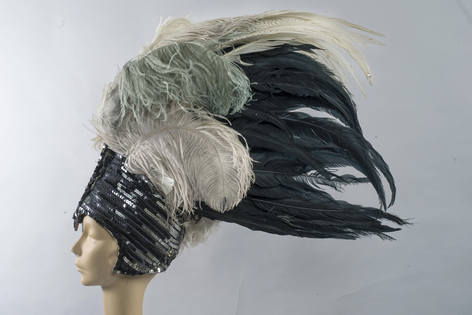 Tocado de plumas conformado por una base tipo casquete semirígido, construido por entretela y metal, con acolchado en espuma. Este casquete está cubierto por un textil negro decorado con lentejuelas cosidas en hileras horizontales. Desde esta base emerge un gran penacho compuesto por diversos tipos de plumas largas negras, blancas y grises, de avestruz, posiblemente faisán. El casquete se ajusta a la cabeza por medio de un elástico amarrado en la nuca.