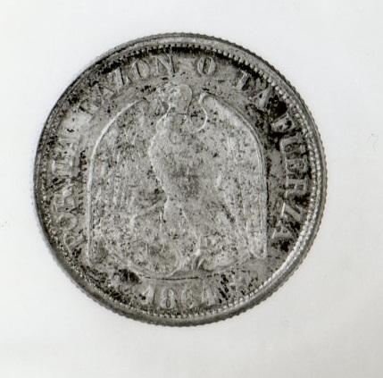 Objeto metálico de formato circular. En el anverso aparece un escudo chileno de forma irregular, con penacho, circundado por dos ramas de laurel atadas con una cinta. Le rodea una leyenda. Por el reverso, un cóndor con alas expendidas, con eslabones de cadena en el pico y garras. Le rodea una leyenda.