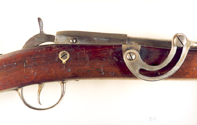 Arma de fuego larga de retrocarga, de madera, con fuego central y palanca que acciona el cubre recámara. Cañón de acero estriado, con alza y porta bayoneta lateral derecho. Con baqueta.