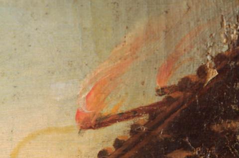 Obra de formato rectangular con marco dorado, donde se muestra escena bélica. Gran cantidad de soldados de uniforme rojo y blanco por un bando y azul por el otro. Al centro se observan dos torres de una iglesia y una bandera que flamea entre ellas.
