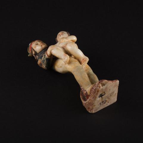 Objeto de uso decorativo. Figura masculina de cuerpo completo, vestido con chaqueta azul y sombrero azul y rojo. Sostiene en sus brazos un niño desnudo. Está parado sobre una base de color café.