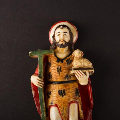 Figura masculina de pie sobre pedestal rectangular tallada en piedra y policromada. Pelo largo, barba y aureola. Con la mano derecha sostiene una cruz de color verde. Con la mano izquierda un libro y un cordero. Viste túnica corta de color amarillo con diseños negros y sobre sus hombros capa larga roja.