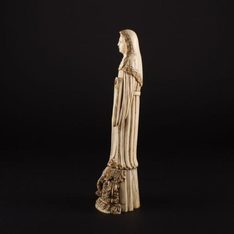 Figura femenina de cuerpo completo, de pie, vestida con hábito de mangas anchas y una indumentaria larga y estriada, lleva un cinto a la cintura. Está sobre un pedestal con decoración fitomorfa.