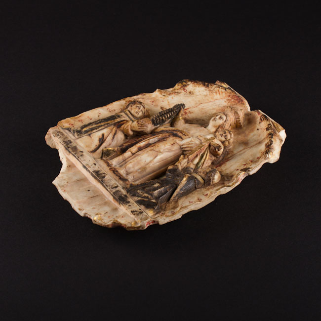 Objeto de uso decorativo. Representación de una figura femenina ubicada al centro con un niño en un brazo y un rosario en la otra mano. El niño sostiene una cruz latina. A los costados dos figuras masculinas arrodilladas. Por el reverso una representación de un bivalvo estriado.