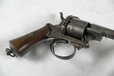 Objeto de metal con empuñadura de madera. El objeto contiene varias piezas como cañón, armazón, tambor que contiene las balas, martillo y disparador entre otros.