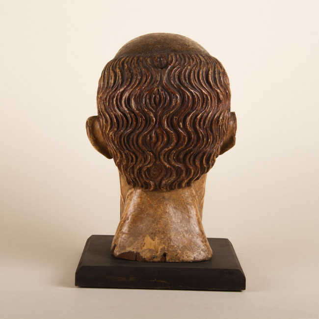 Objeto de uso religioso. Cabeza de figura masculina realizada en madera, la que se posa en base de madera cuadrangular lisa. El rostro es de color mate oscuro con arrugas en la frente, posee ojos café y pómulos rosados con la boca entre abierta dejando ver los dientes. Posee cabellos ondulados con tonsura clerical. Un largo tornillo se ubica en la nuca.