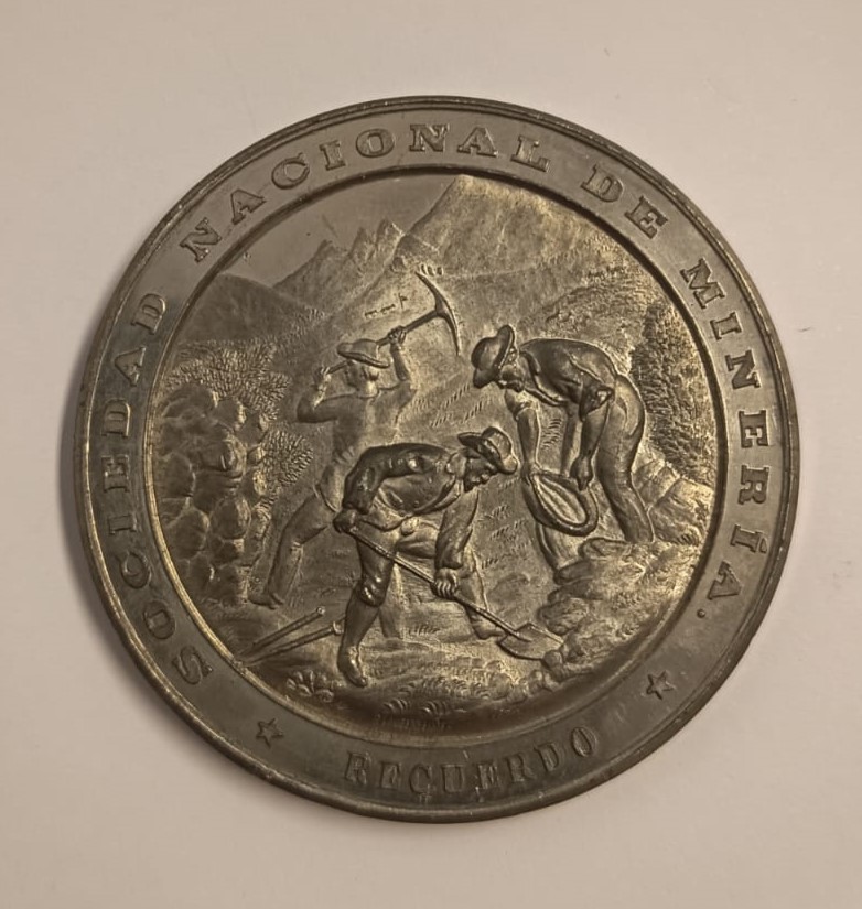 Objeto metálico de forma circular. Por el anverso aparece, al interior de una circunferencia, un escudo con una estrella al centro, sostenido por un cóndor y un animal cuadrúpedo rampante. Al exterior de la circunferencia, una leyenda. Por el reverso, una serie de figuras masculinas trabajando la tierra con picota y sombrero. Le rodea una circunferencia y una leyenda.