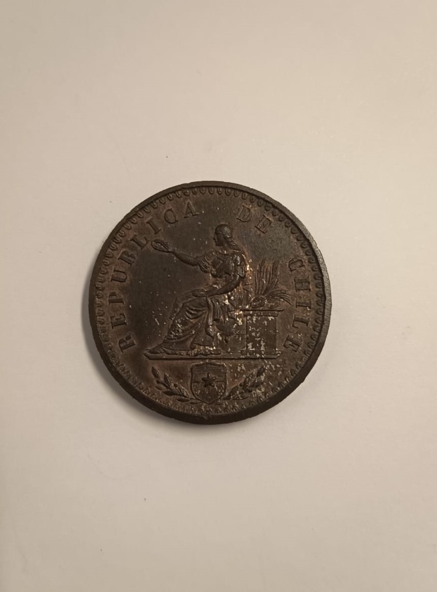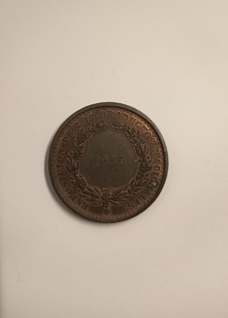 Objeto metálico de forma circular. En el anverso aparece una figura femenina sentada, en la parte inferior un escudo sobre dos ramas de laurel. Con el brazo derecho estirado sostiene una corona de laureles. Por el reverso, un número de cuatro dígitos rodeada por una corona formada por espigas de trigo, ramas de laurel, encina y comienza con un racimo de uva. Le rodea una leyenda.