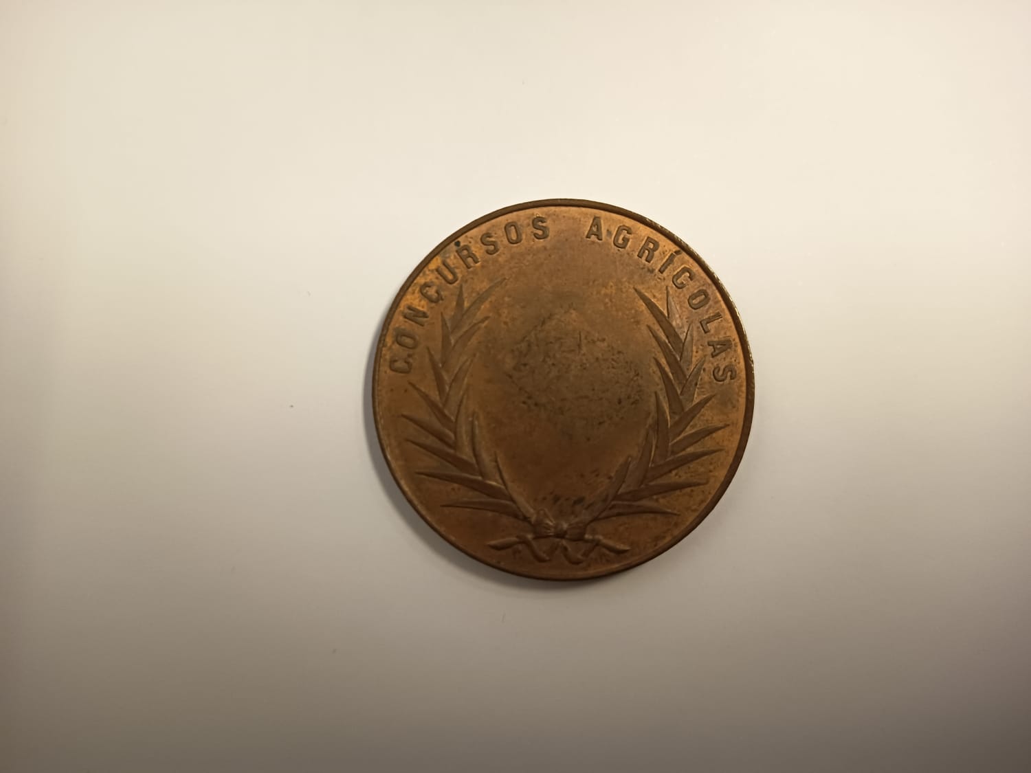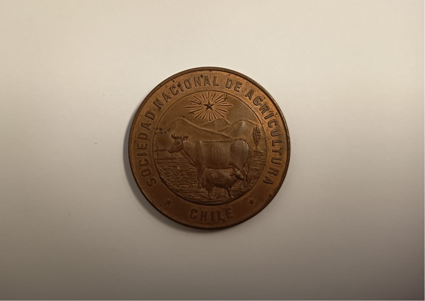 Objeto metálico de formato circular. Por el anverso representa, al interior de una circunferencia, una vaca y una oveja. Al fondo, montañas y sobre ellas una estrella radiante. Le circunda una leyenda. Por el reverso, una corona de palmas y una leyenda en la parte superior.
