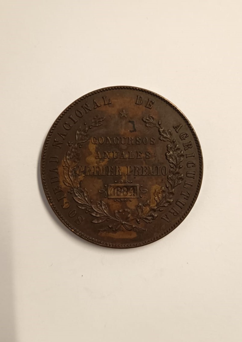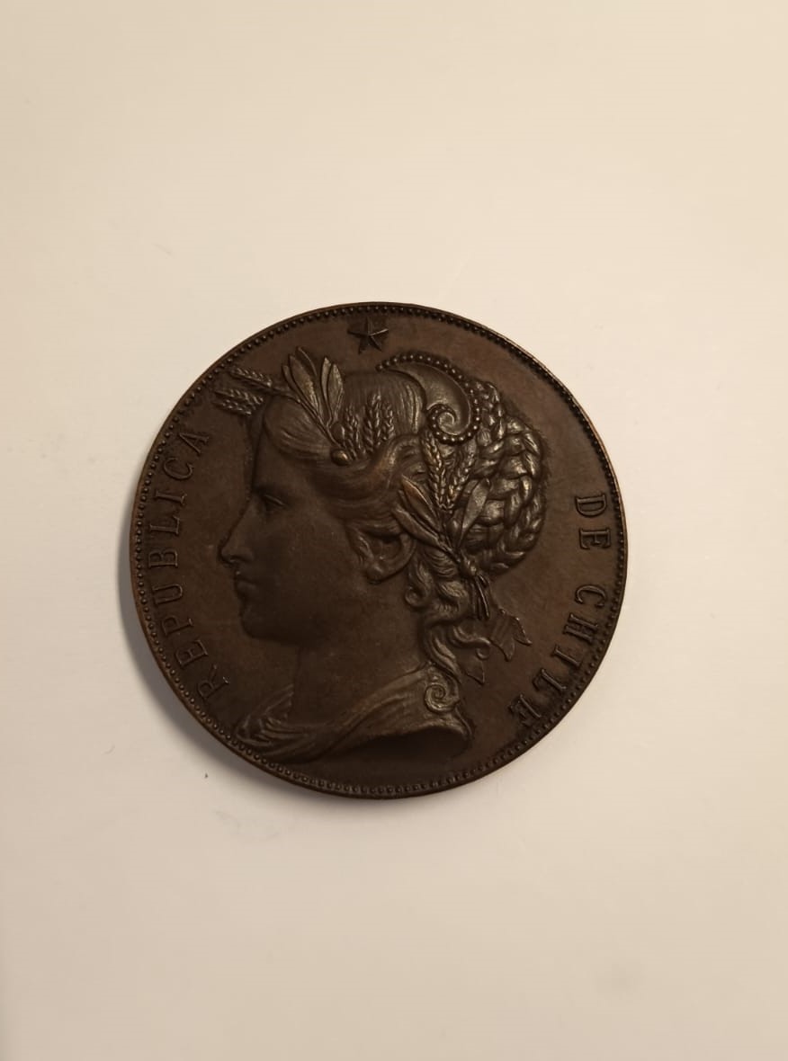 Objeto metálico de forma circular. Por el anverso representa un rostro de mujer de perfil hacia la izquierda, con cabello trenzado y recogido, corona de espigas y ramas de olivo, y adorno de perlas. Sobre la cabeza una estrella de cinco puntas y una leyenda. Por el reverso, una leyenda dentro de una corona formada por una rama de laurel y otra de encina atadas con una cinta.