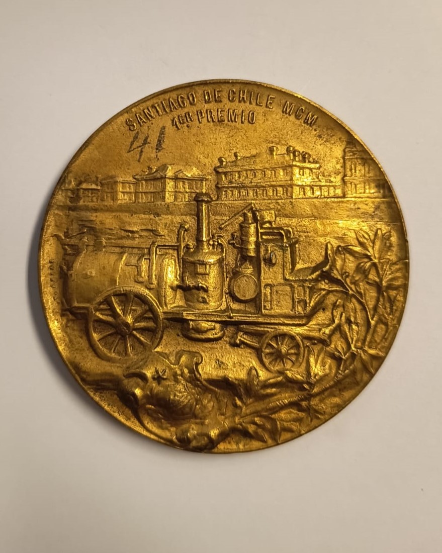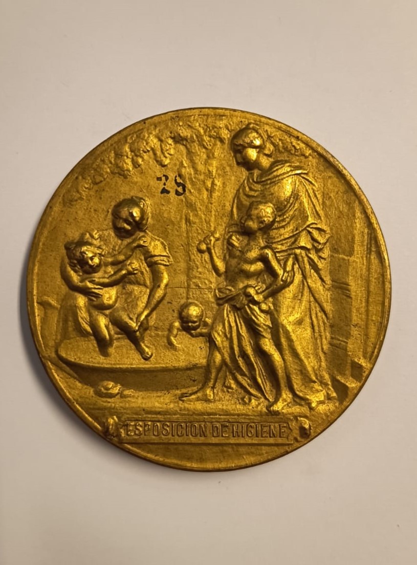 Objeto circular metálico, en el anverso presenta cuatro figuras dos mujeres e infantes, una bañando a niño; ellas visten atuendo clásico y los niños está semidesnudos. En el exergo se observa una cartela con la inscripción ESPOSICION DE HIGIENE. El reverso tiene la figura de una máquina y la inscripción SANTIAGO DE CHILE/ 1ER PREMIO junto al borde superior; esta es tipo locomóvil, formada por cuerpo cilíndrico; en el extremo inferior, se observa un escudo y rama de laurel, este es el antiguo emblema de la ciudad de Santiago.