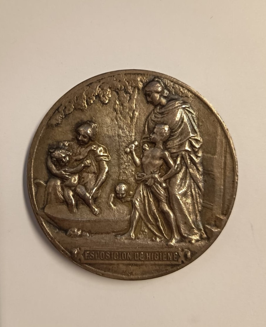 Objeto metálico de forma circular. Por el anverso representa una mujer de pie envuelta en mantas, que conduce a un niño con torso desnuco hacia una bañera, donde hay otra mujer mayor bañando a un niño pequeño. Otro niño pequeño introduce su mano al agua. En la parte inferior una leyenda. Por el reverso, maquinaria con grandes ruedas, en primer plano una rama y un tronco. Al fondo, unas edificaciones.