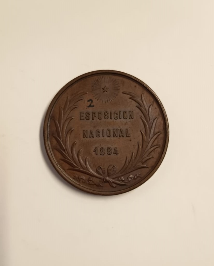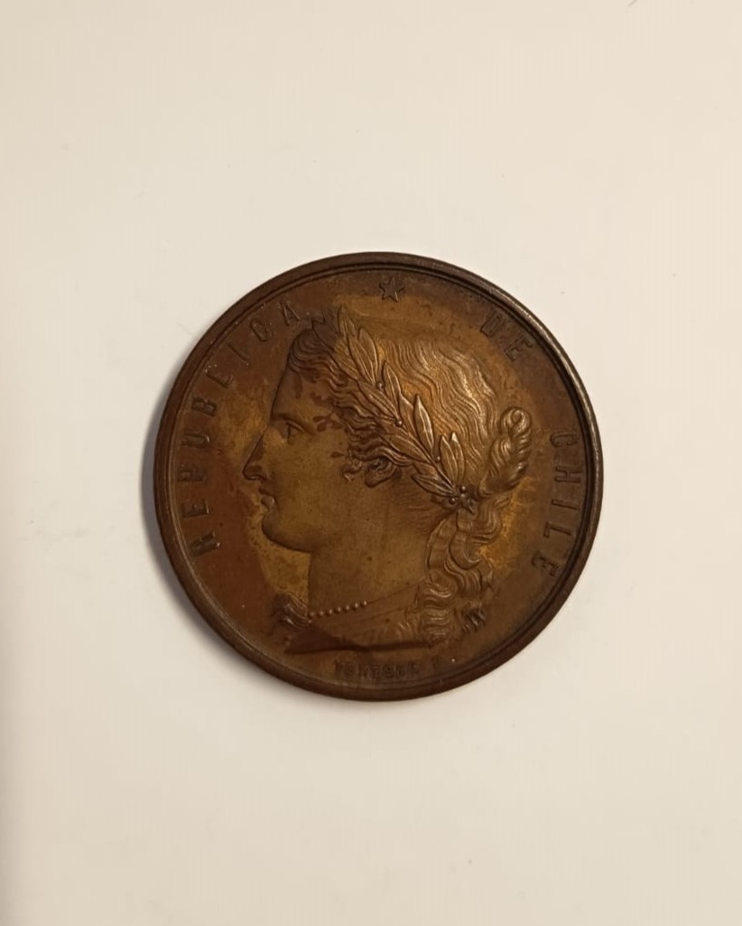 Objeto metálico de forma circular. Por el anverso representa un rostro femenino de perfil, con cabello recogido, corona de laurel y collar de perlas. Una leyenda en arco en la parte superior. Por el reverso, una estrella de cinco puntas radiante en la parte superior. Una leyenda rodeada por corona de palmas atada con una cinta.