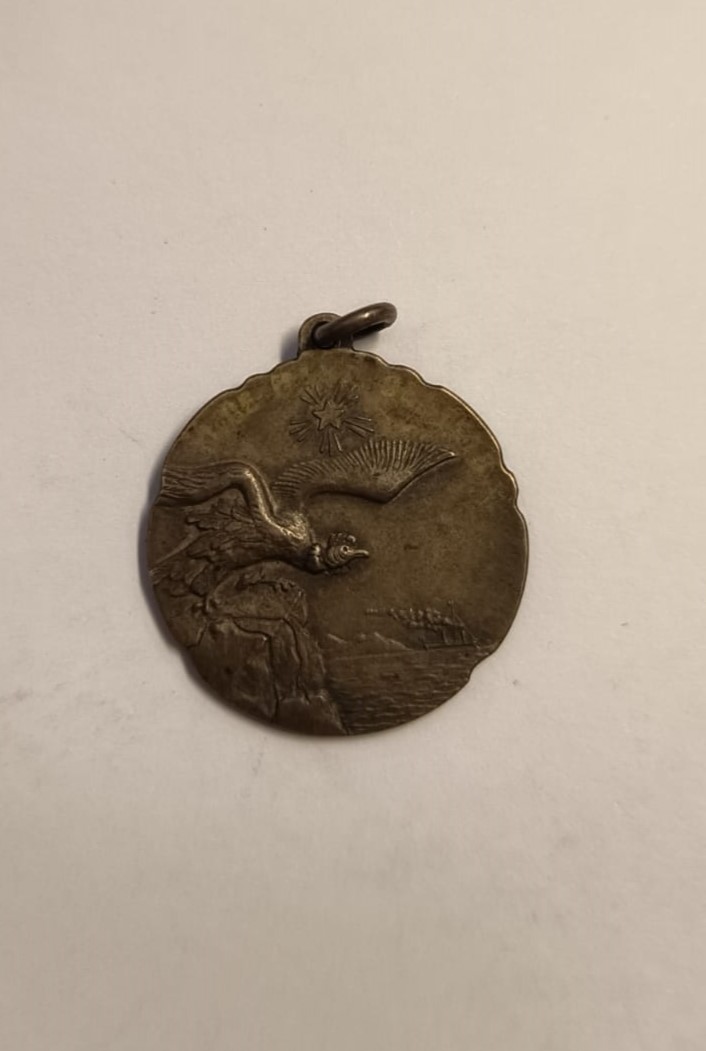 Objeto metálico de forma circular, con bordes irregulares y argolla en la parte superior. Por en anverso representa un escudo con penacho, con faja central y leyenda. Está rodeado por ramas de laurel y rodeado por leyenda. Por el reverso un cóndor en vuelo sobre unas rocas a la orilla del mar. En el horizonte un barco y montañas, estrella radiante en la parte superior.