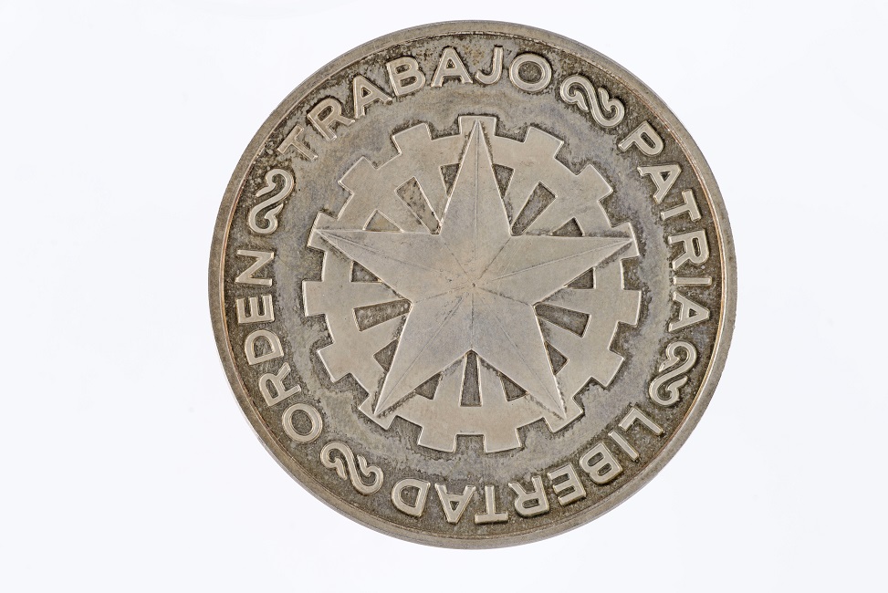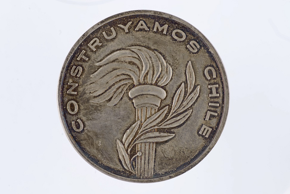 Medalla circular de metal. El anverso presenta una antorcha y una rama de laurel que le cruza, tiene la ceca de Santiago y una inscripción : CONSTRUYAMOS CHILE. El reverso tiene una estrella sobre un engranaje y junto al borde la inscripción PATRIA LIBERTAD ORDEN TRABAJO .