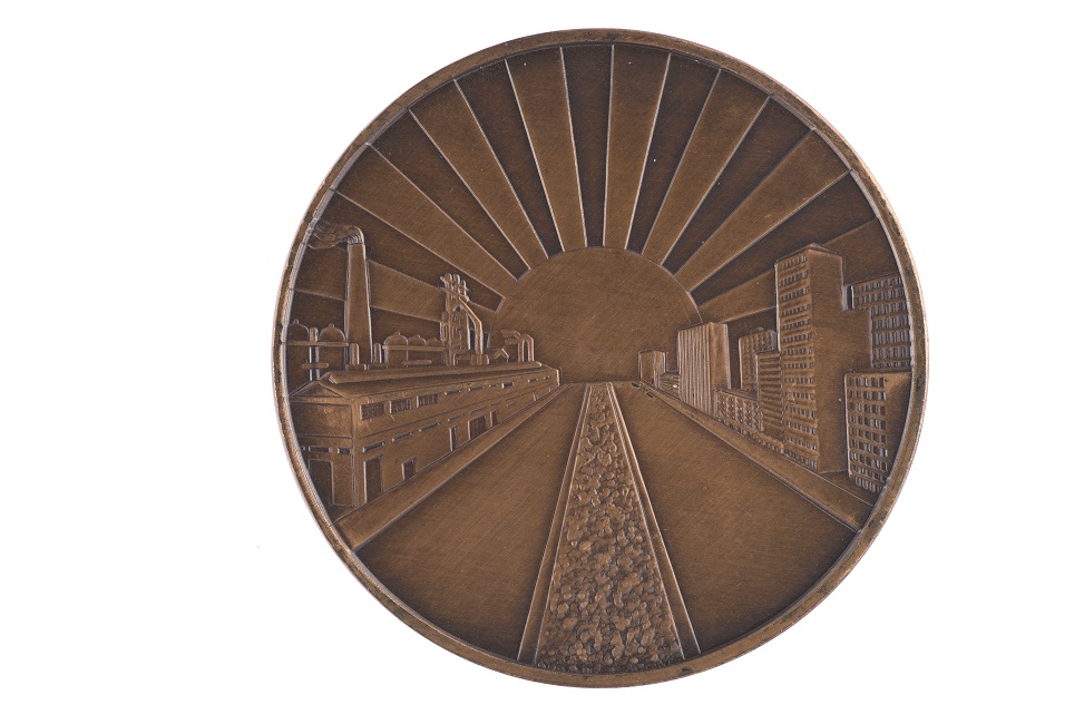 Medalla circular, al anverso presenta tres rostros juntos, de perfil y la inscripción CONSTRUYAMOS/ CHILE. El reverso presenta un paisaje urbano con una avenida central y edificios a cada lado, un medio círculo con segmentos en diagonal que representan un sol radiante.