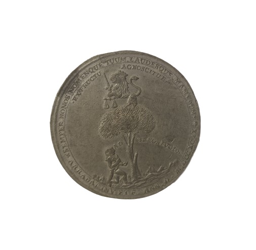 Moneda metálica de color plateado oscuro y forma circular. Por el anverso representa un león coronado posado sobre la copa de un árbol. El tronco del árbol flanqueado con la inscripción AD TECONFUGIO. Bajo el árbol aparece una persona arrodillada. En la parte superior en arco, la inscripción EX FRUCIU AGNOSCITUR. Le rodea la leyenda SEMPER HONOS NOMEN QUE TUUM LAUDESQUE MANEBUNT. En la parte inferior ARRABAL INV. ET F. ANN. D. M. DCC.XCIX. Por el reverso, un escudo con celada coronada y rodeado de banderas y banderines, que a su vez se rodea de una leyenda.